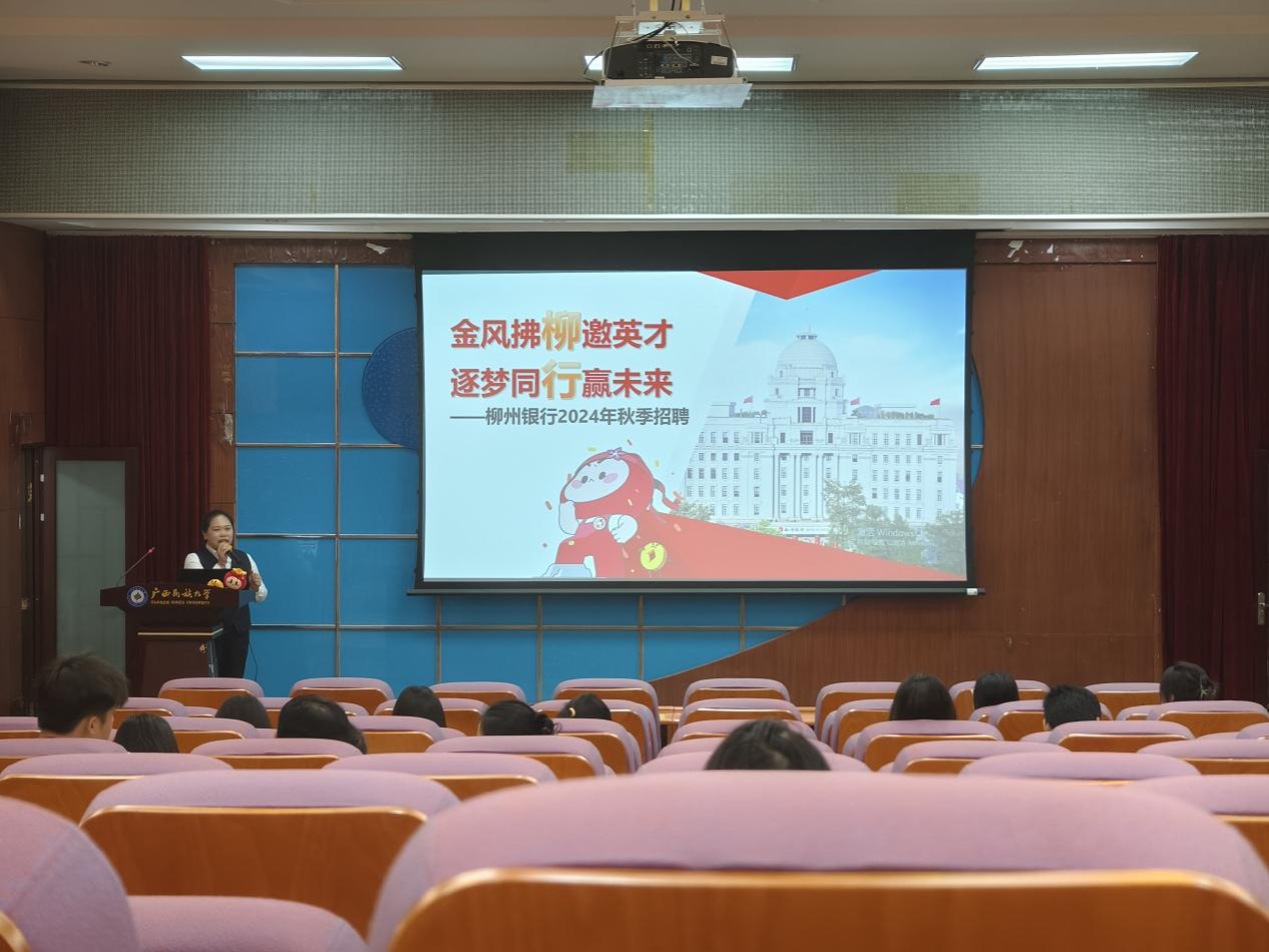 2024年10月25日上午,betway必威西汉姆联官网于至善楼报告厅举办柳州银行股份有限公司招聘宣讲会。本次宣讲会由柳州银行工作人员主讲,2021级部分学生参会。