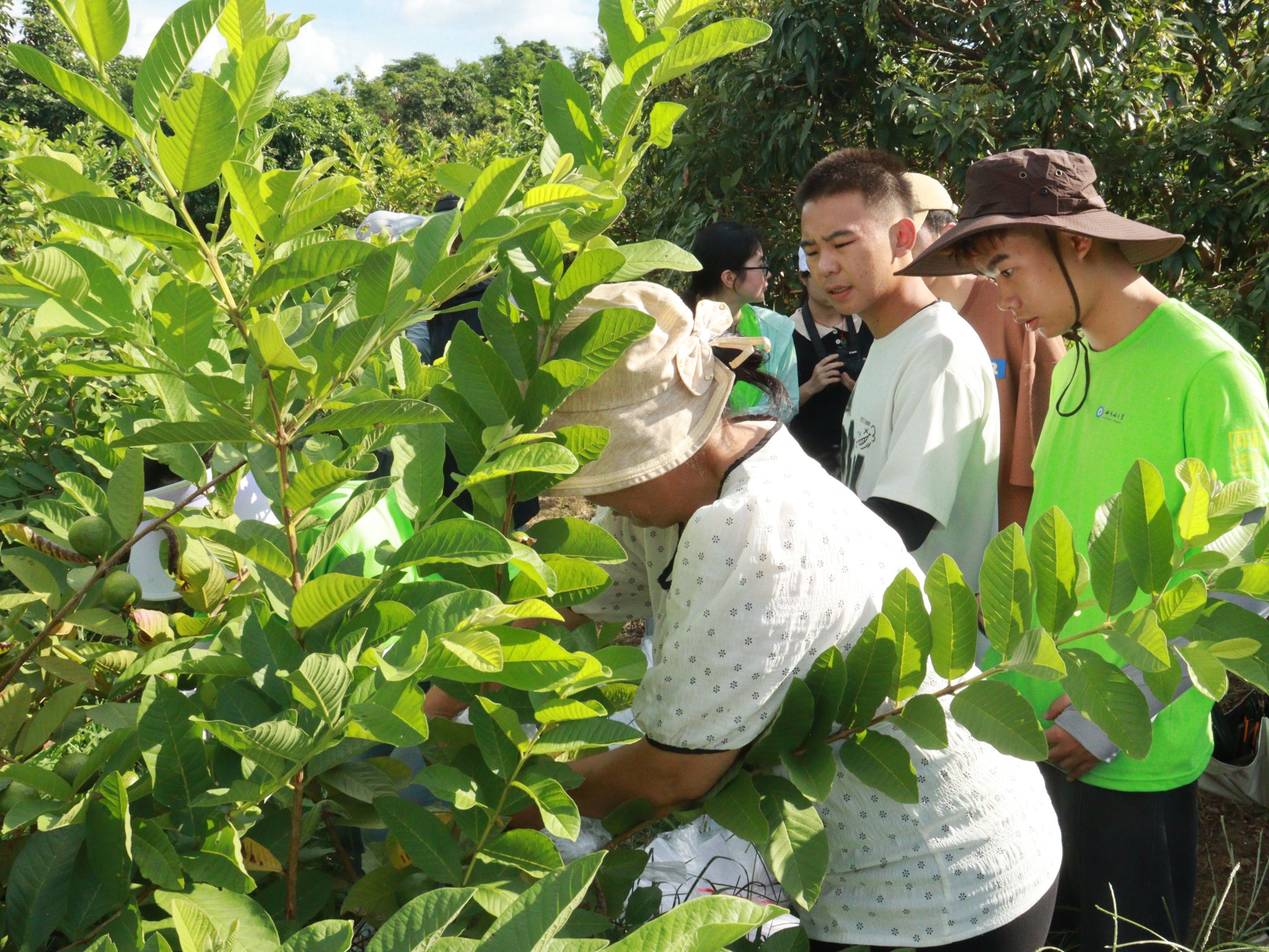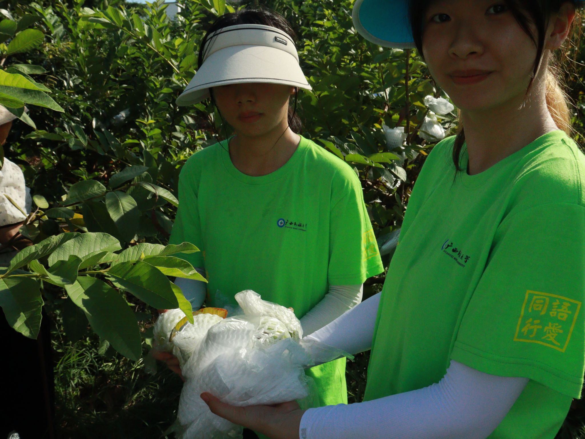 成员们展示套袋后的番石榴