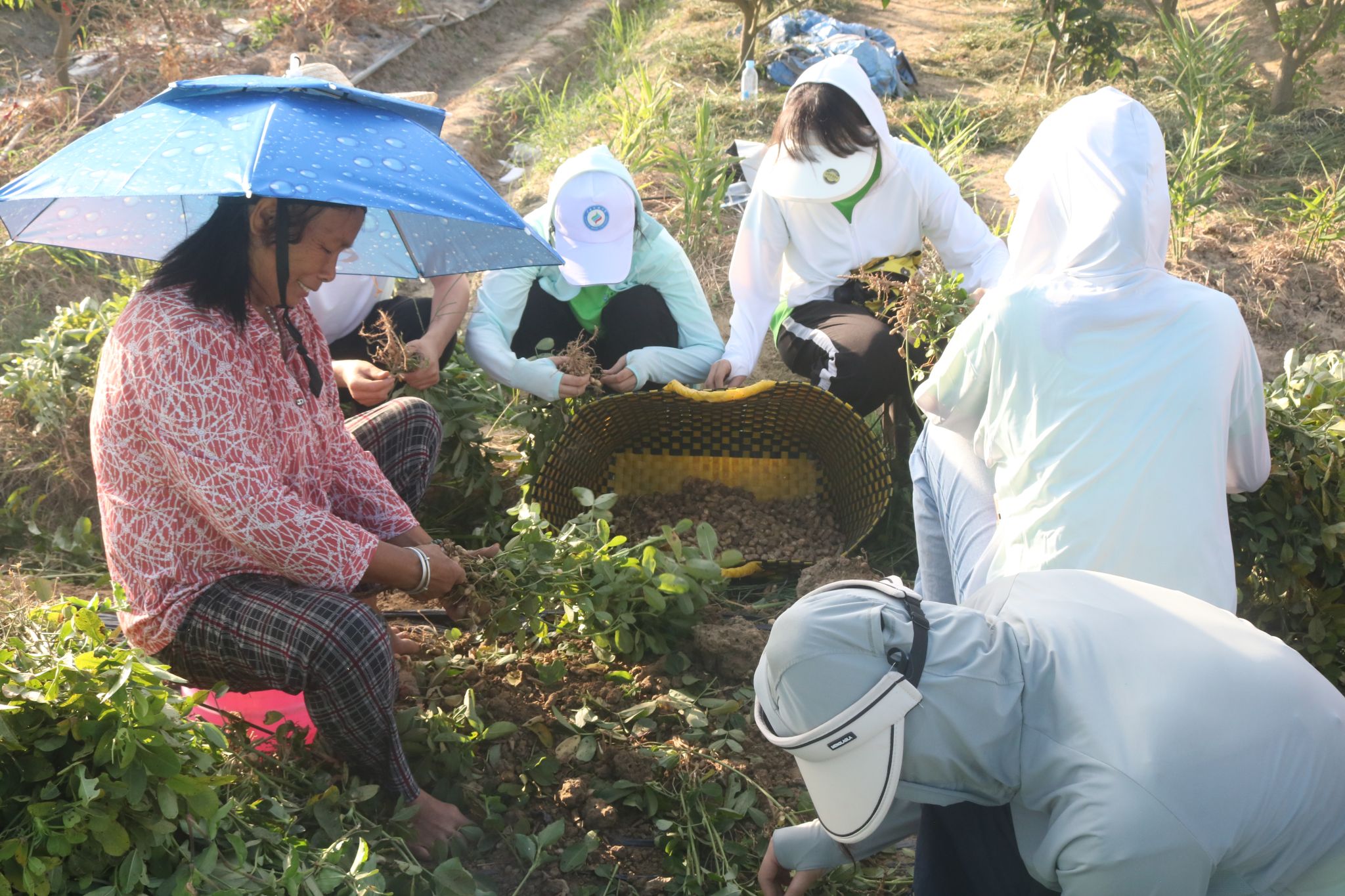 成员们齐心协力收花生