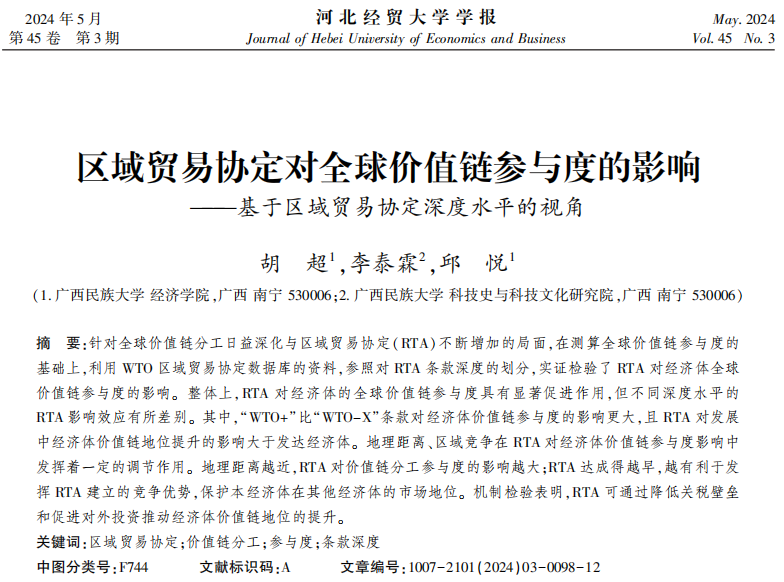 近期,我院胡超老师指导的学生论文《区域贸易协定对全球价值链参与度的影响——基于区域贸易协定深度水平的视角》在全国中文核心、CSSCI扩展版期刊《河北经贸大学学报》(双月刊)2024年第3期发表。该文针对全球价值链分工日益深化与区域贸易协定(RTA)不断增加的局面,在测算全球价值链参与度的基础上,利用WTO区域贸易协定数据库的资料,参照对RTA条款深度的划分,实证检验了RTA对经济体全球价值链参与度的影响。(初审:江明子 编辑:易海宁、汤嘉颖 校对:魏年满 复审:郭李俊 终审:蓝巧燕)