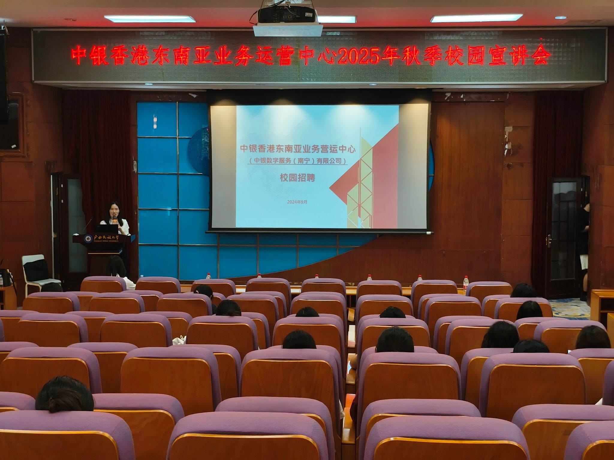 9月20日,betway必威西汉姆联官网于至善楼报告厅顺利举办中银香港东南亚业务运营中心2025年秋季校园宣讲会。会议由中银数字(南宁)有限公司工作人员主讲,2021级部分学生参会。