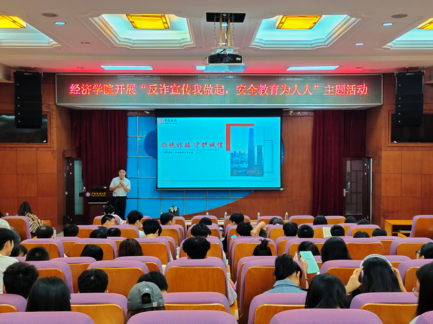 宣讲会上,中国银行广西分行经理通过生动鲜活的真实案例向同学们介绍了网络贷款和校园贷的形式,并向同学们普及了冒充公检法诈骗、虚假平台投资理财诈骗等六大诈骗类型。同时,告诫同学们不要轻信陌生人所说的内容、不轻易操作自己的银行账户,希望同学们牢记“六个一律”“八个凡是”等识诈、防诈的应对方法。