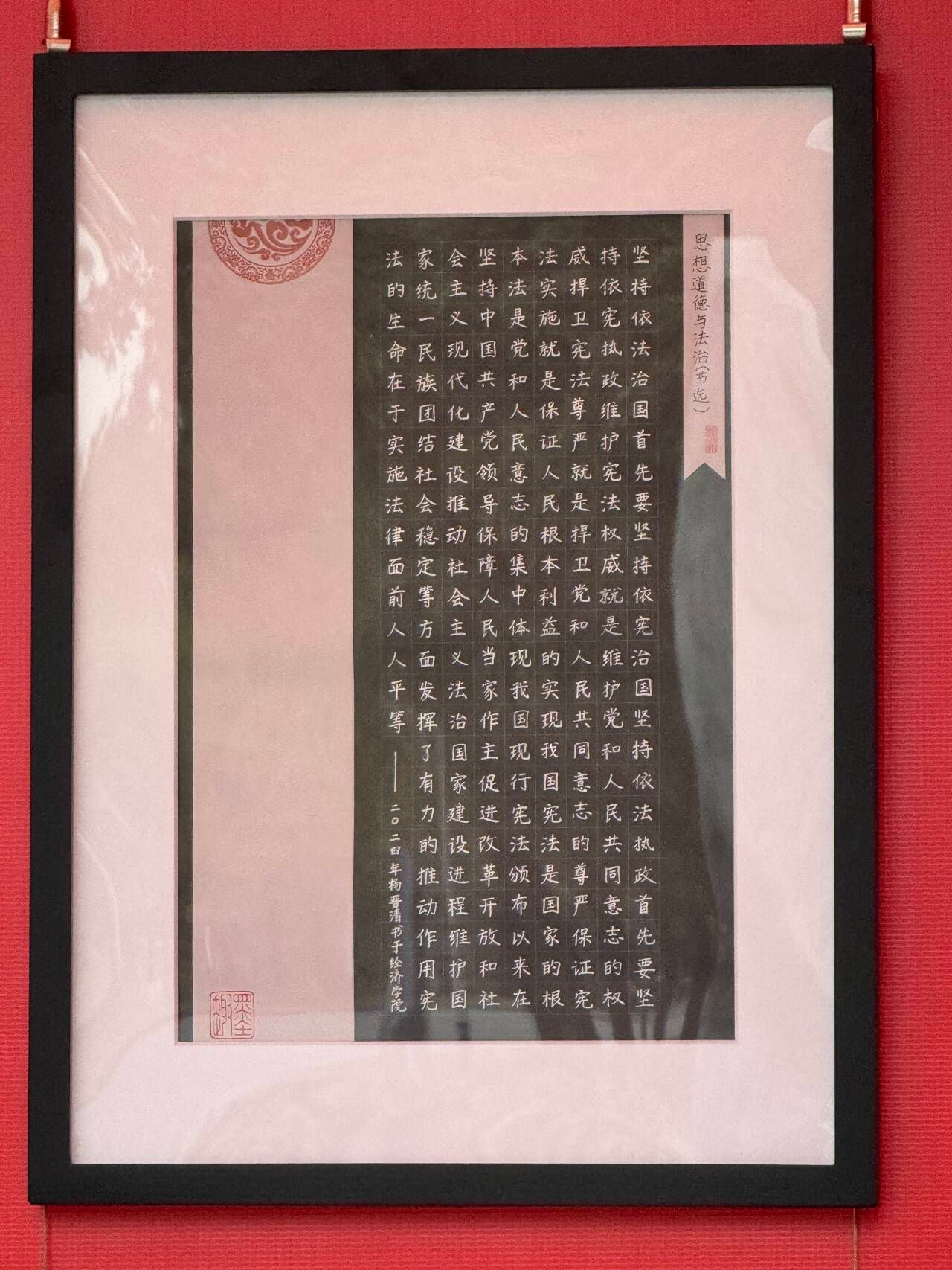 我院同学通过书法的艺术形式,以笔墨为载体,将对宪法及其精神的理解和感悟融入一笔一划之中。作品展现了对宪法的尊重和对法治精神的追求。最终,我院四份优秀作品在学校宪法宣传周活动中展出,为学校宪法宣传周活动注入了活力。(初审:段莹 编辑:张晶晶、蓝煜然 校对:许寿益 复审:郭李俊 终审:蓝巧燕)