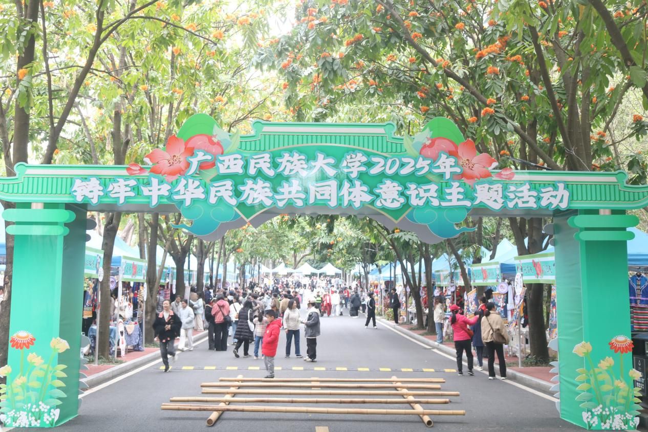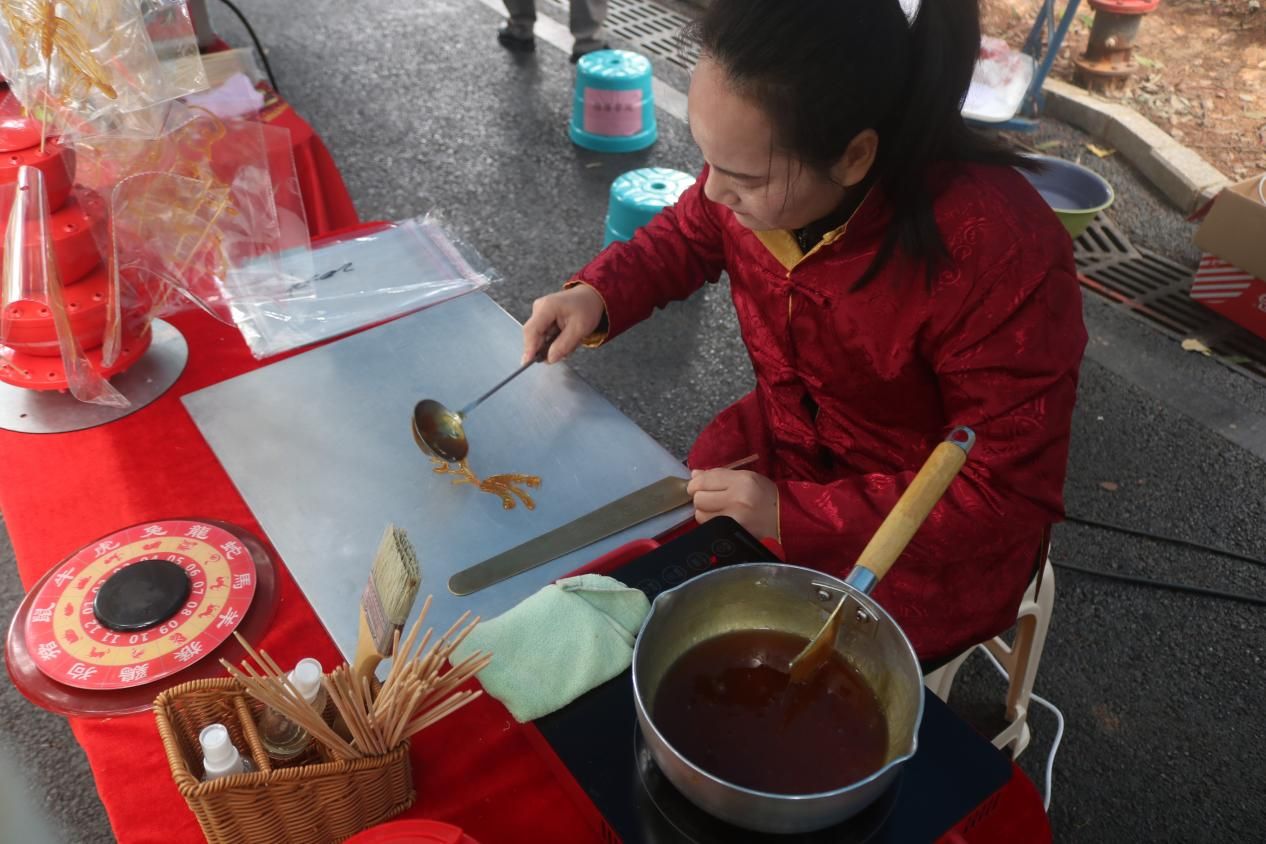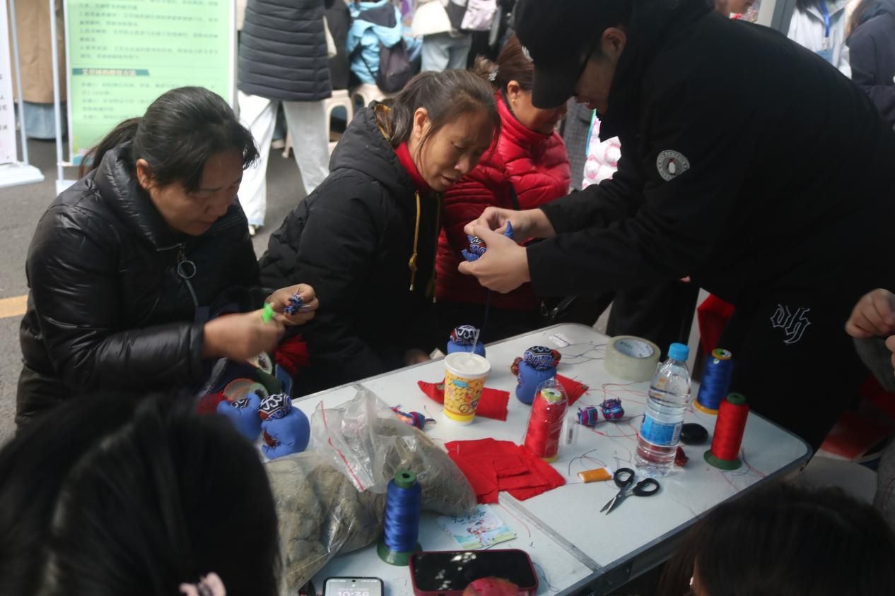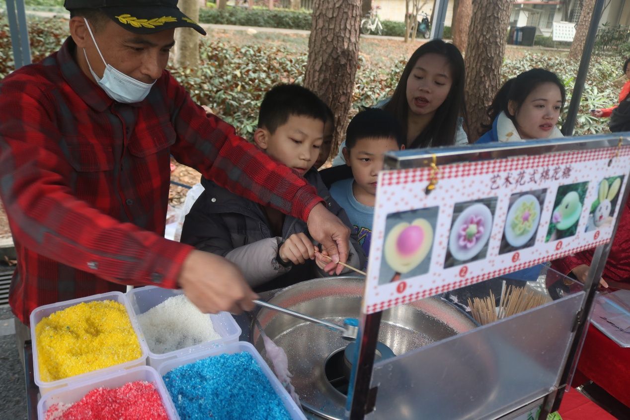 铸牢中华民族共同体意识主题活动现场上,我院负责开展民族非遗制作活动,摊位设置了糖葫芦、棉花糖、麽乜制作等民俗体验项目,吸引师生踊跃参与。活动现场热闹非凡,同学们热情高涨,沉浸式体验丰富多彩的民族非遗制作。在棉花糖制作区域,五彩的糖在师傅手中变化为糖花,同学们认真观看和学习棉花糖的制作过程。在制作麽乜区域,师生们一同挑选壮族锦绣,精心裁剪、缝制。师生们在品尝美食和制作非遗工艺品中领略民族文化魅力。