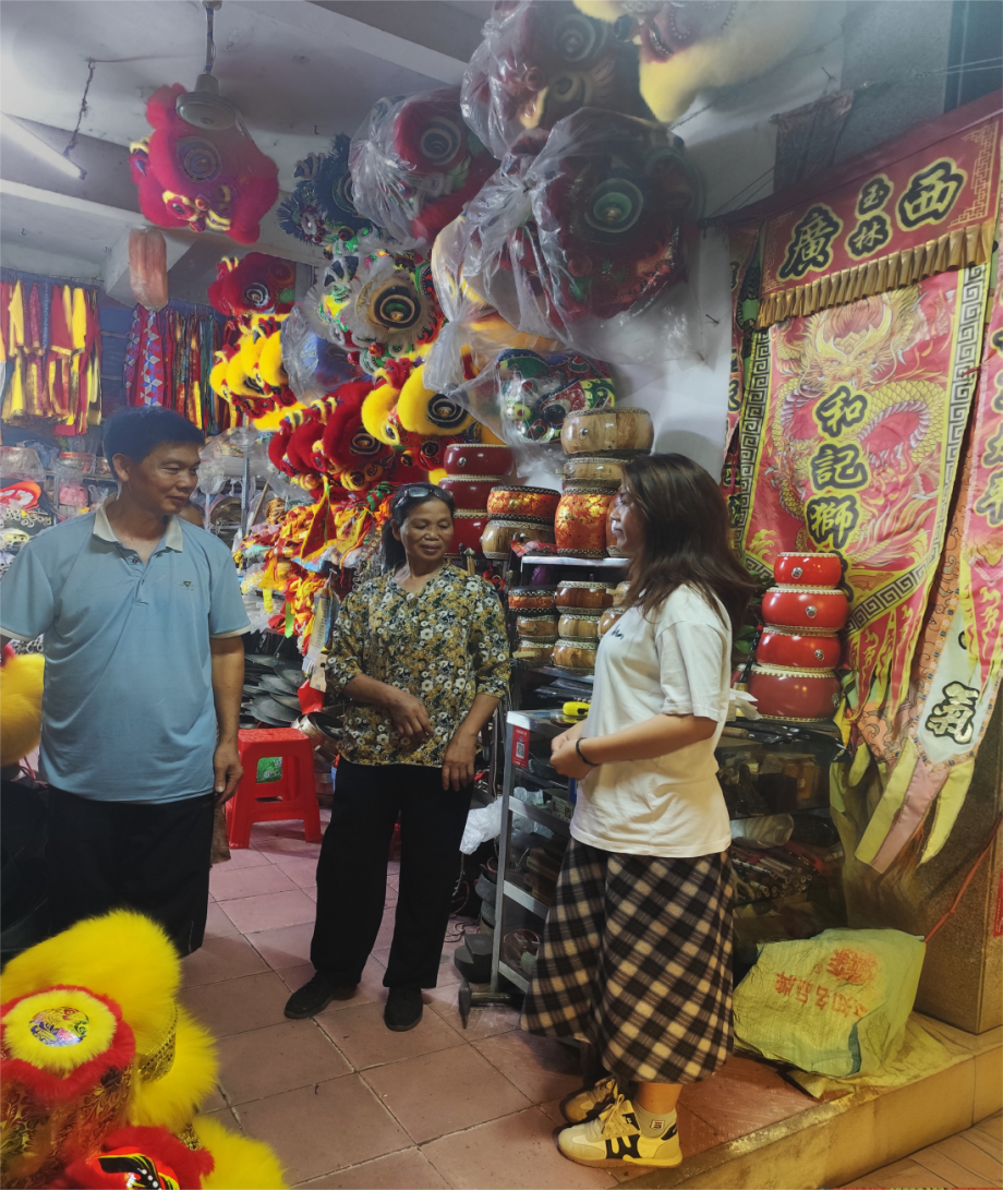 团队首站走访和记狮鼓店铺,深入了解狮头样式、制作工艺及色彩文化寓意,梳理狮舞文化核心内涵。通过与店主交流,明晰技艺传承演变、文化发展脉络,同时聚焦当前传播瓶颈,思考年轻化、潮流化转型路径。