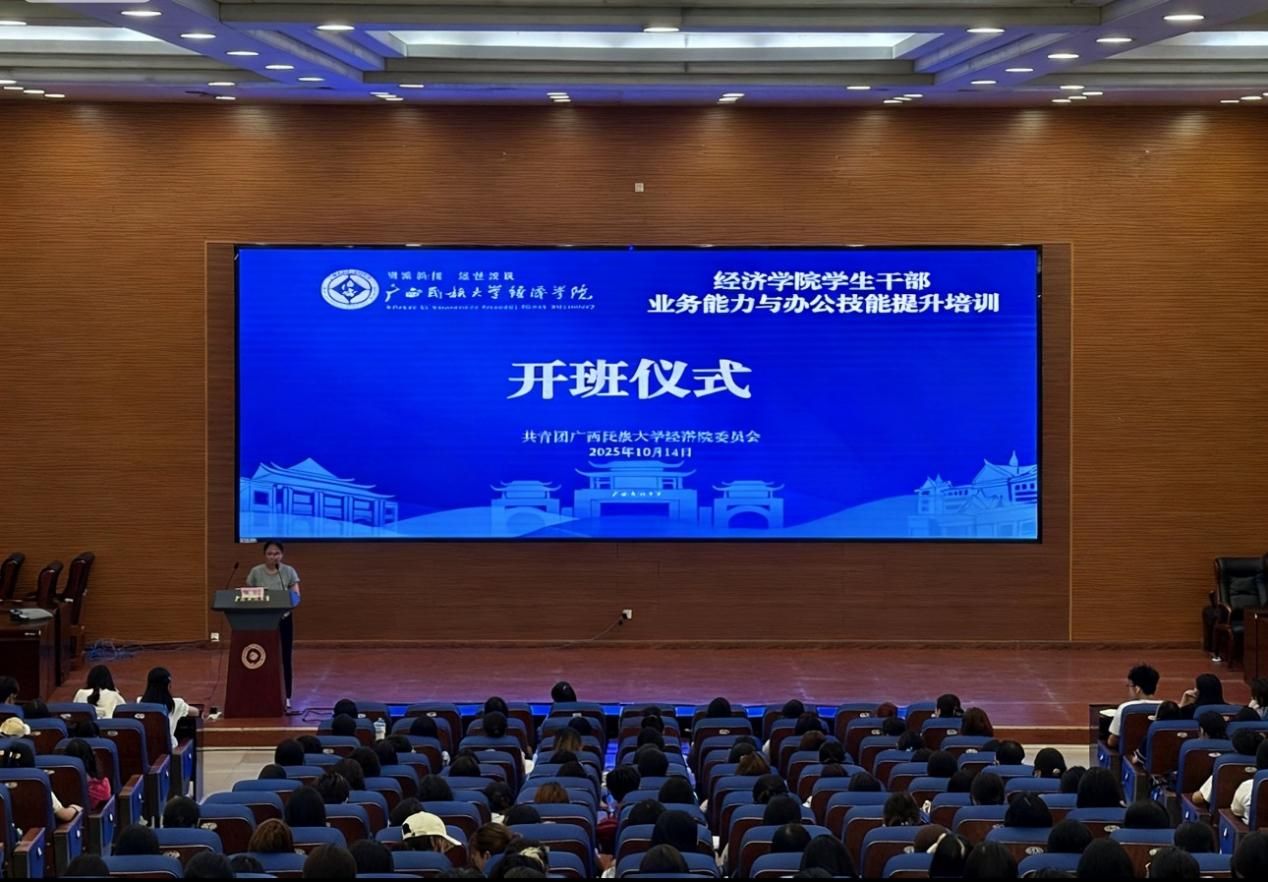 2025年10月14日,我院学生干部业务能力与办公技能提升培训班开班仪式在明德楼报告厅顺利举行。团委书记段莹、专职辅导员吕亮宇出席开班仪式,兼职辅导员于彤政主持,团委、学生会、党建工作站、新闻传媒中心全体成员参加。