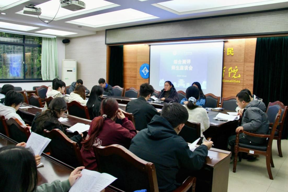 2025年11月18日,我院于格物楼206室举行综合测评师生座谈会。本次会议由我院团委书记段莹主讲,部分辅导员、班主任及2023和2024级各班级综合测评负责人参会。