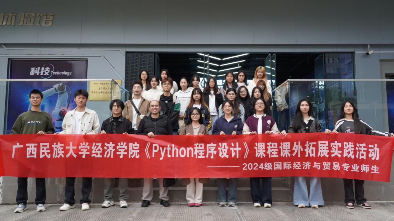 为增加人工智能前沿科技与运用体验感、认识AI技术的当前发展与未来趋势,同时将专业知识与科技新创想融合,探讨科技对经贸未来格局的影响。12月5日,广西民族大学betway必威西汉姆联官网24级国际经济与贸易专业同学以及部分研究生同学,在潘昱老师的带领下前往南宁市职工AI科技教育体验馆开展《Python程序设计》课程课外拓展实践活动。