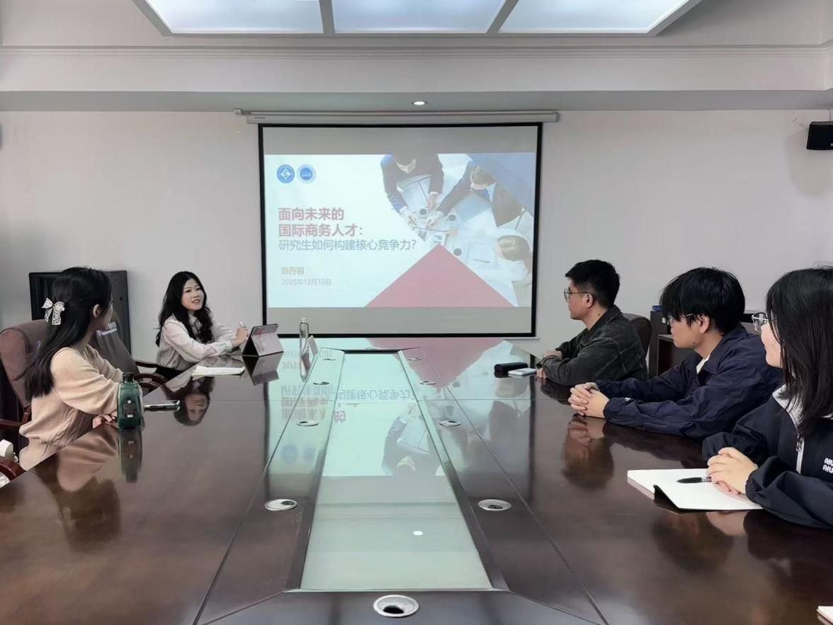 2025年12月10日下午,我院开展了《面向未来的国际商务人才:研究生如何构建核心竞争力?》主题交流会。特邀国际商务硕士校外导师、广西外国语学院数字经济管理学院副院长刘丹羽副教授担任主讲,2025级国际商务专业学生代表参加。