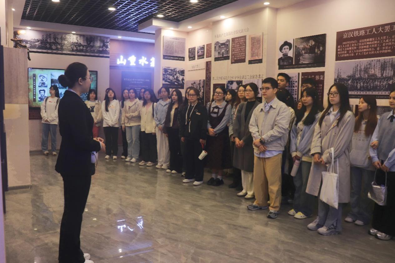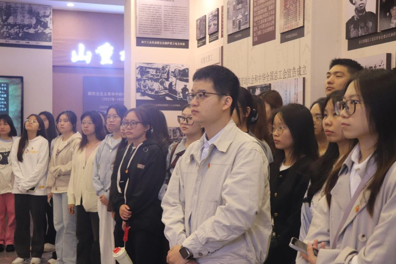 随后,师生们到工人文化宫进行研习。在工运展览馆,师生党员们认真听取讲解员解说,对党的百年工运发展和广西近代工运历史有了更深入的认识。在红色工运教育体验馆,同志们沉浸式体验爱国主义思政教育情景剧《前进!进!》。该剧以情景课堂形式,讲述了田汉、聂耳、夏衍等进步青年文艺工作者投身抗日救亡运动,在上海创作《义勇军进行曲》的故事。